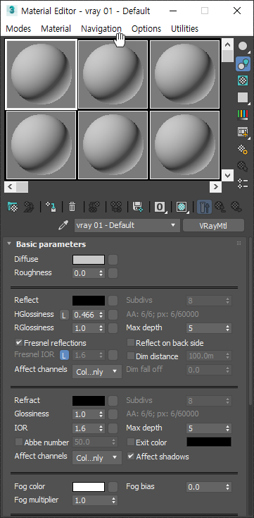 5)씬의 모든 재질이 브이레이 재질(VRayMtl)로 변경되며 재질 편집기에서도 브이레이 재질이 기본으로 설정되어있는것을 확인할수있습니다.