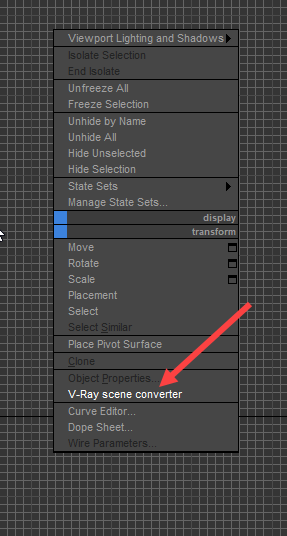 3)뷰포트에서 마우스 우클릭하면 쿼드 메뉴에서 V-Ray scene converter가 표시되는것을 확인할수있습니다.