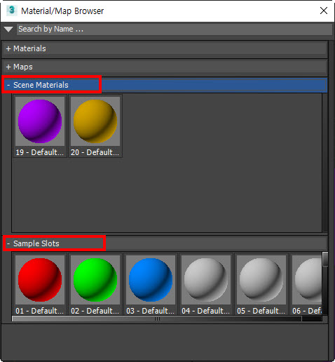 3)scene materials, sample slots에서 씬에서 사용중인 재질을 확인할수있습니다.