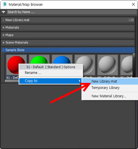 7)재질 라이브러리에 추가할 재질을 선택하고 마우스 우클릭한후 copy to에서 새로 추가한 재질 라이브러리를 선택합니다.
