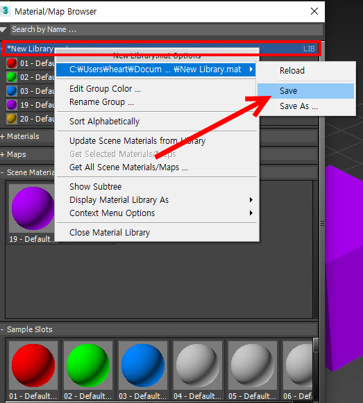 8)재질 라이브러리를 선택하고 마우스 우클릭한후 save를 선택하여 저장합니다.