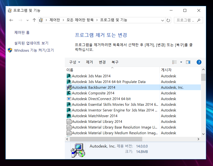 3)윈도우에서 제공하는 프로그램 제거를 사용하여 오토데스크 프로그램을 제거할수있습니다.