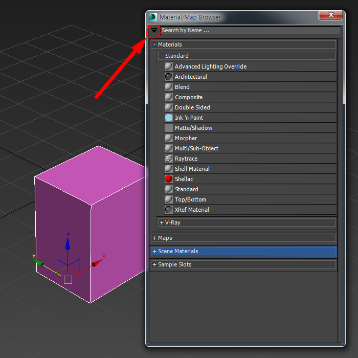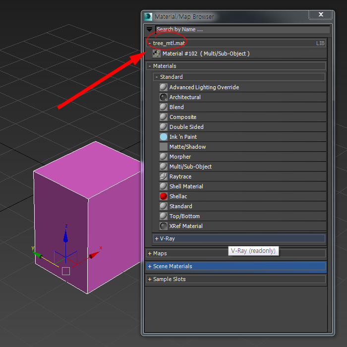 11)material/map browser의 상단에서 가져오기한 재질을 확인할수있습니다.
