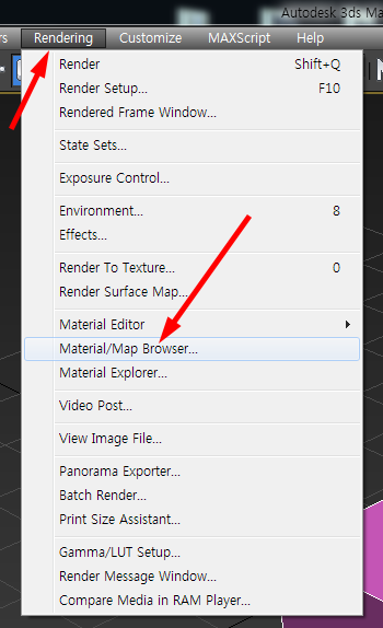 8)상단의 rendering 메뉴에서 material/map browser로 이동합니다.