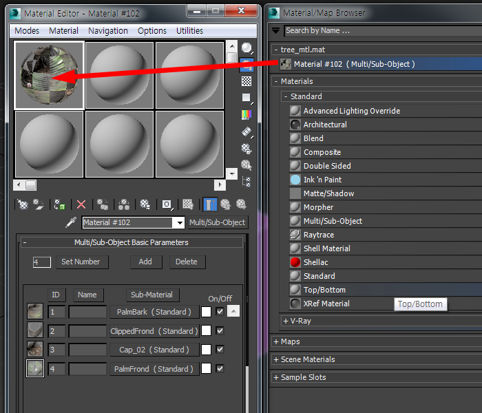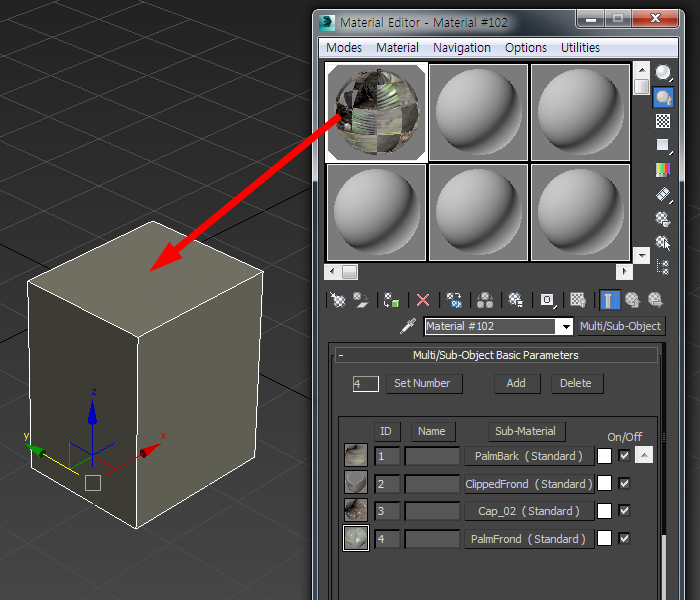 12)재질을 재질 편집기(material editor)의 재질 슬롯에 드래그 드롭합니다.