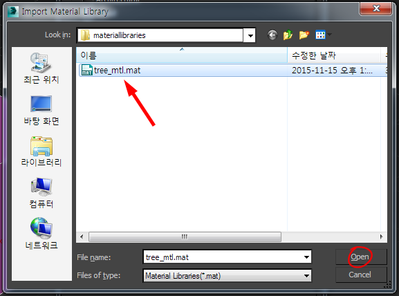 10)오브젝트의 재질 라이브러리 파일을 선택하고 열기합니다.