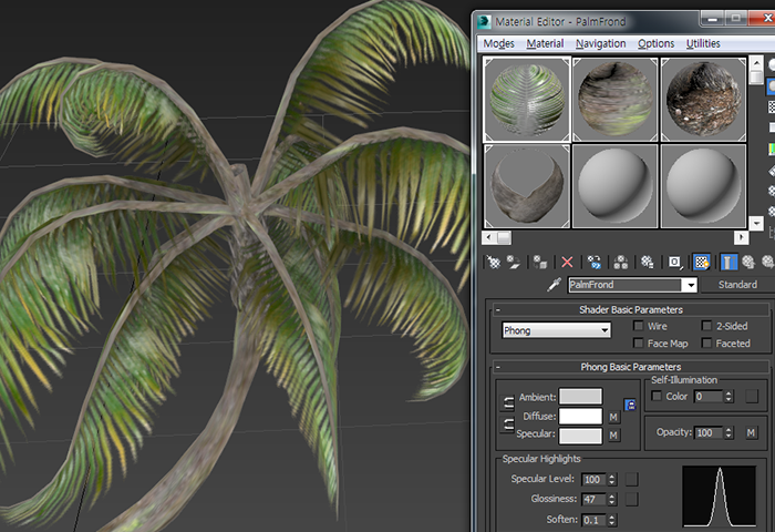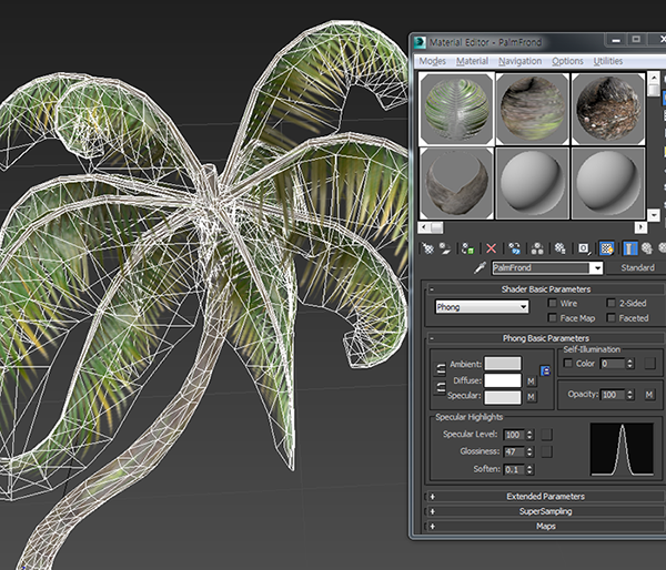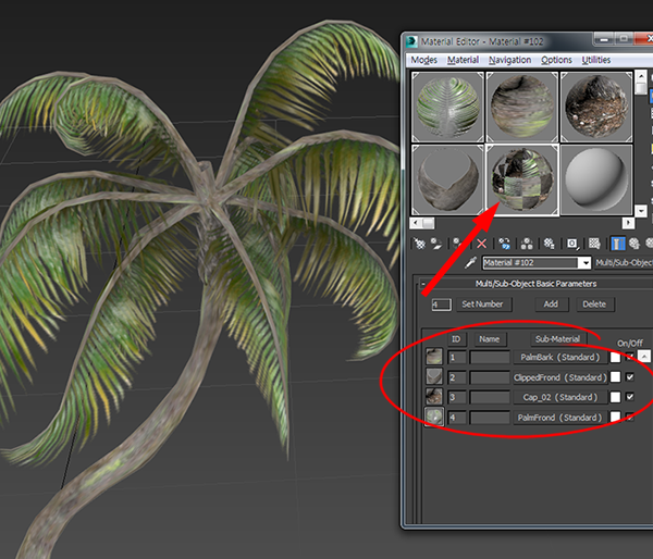 7)나무 모델이 한개의 오브젝트이며 오브젝트의 재질은 네개의 재질을 가지는 다중재질(Multi/Sub-Object)인것을 확인할수있습니다.