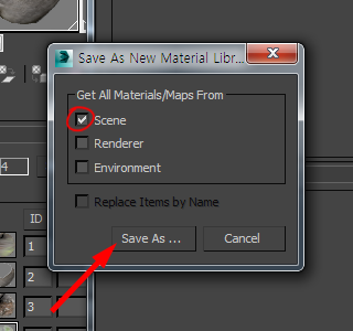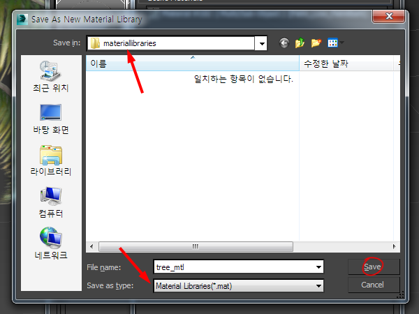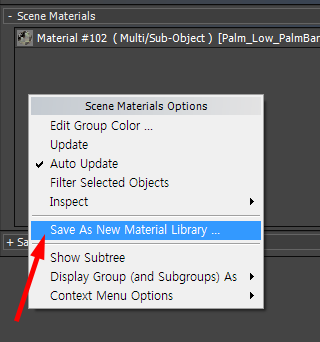 11)마우스 우클릭하고 save as new material library를 선택하면 씬에서 사용하는 모든 재질(scene materials)을 재질 라이브러리 파일로 저장합니다.