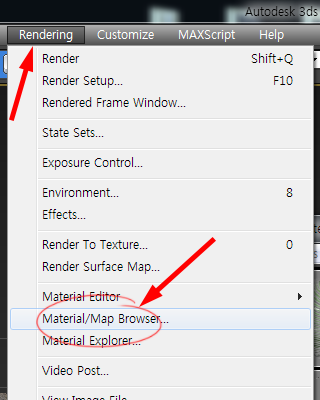 8)재질(Multi/Sub-Object)을 저장하기위해 상단의 rendering 메뉴에서 Material/Map browser로 이동합니다.