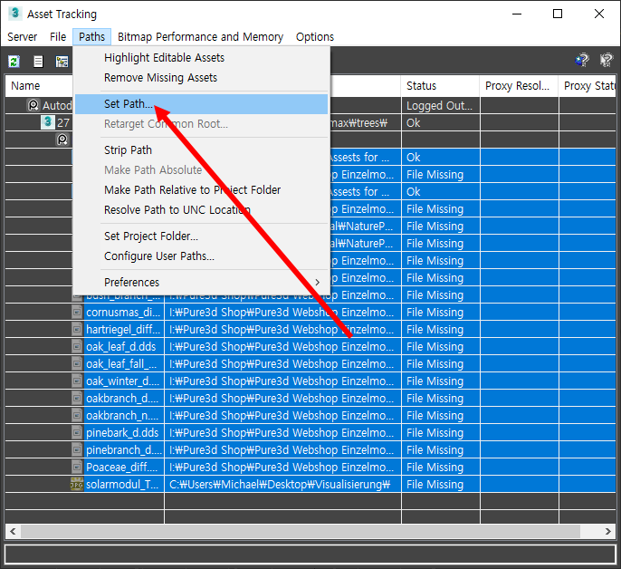 3D 맥스에서 누락된 비트맵의 파일 경로 재설정하기(asset tracking)