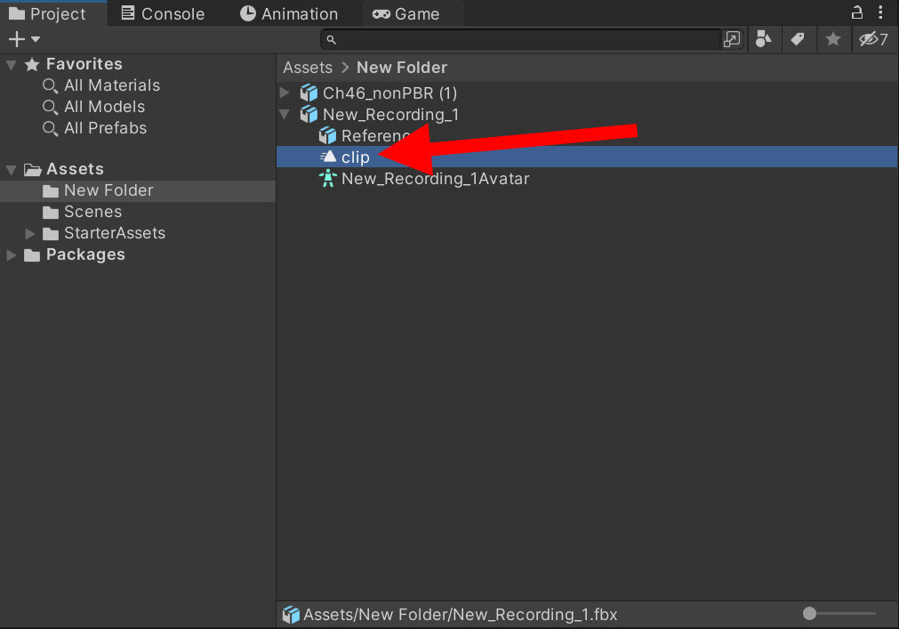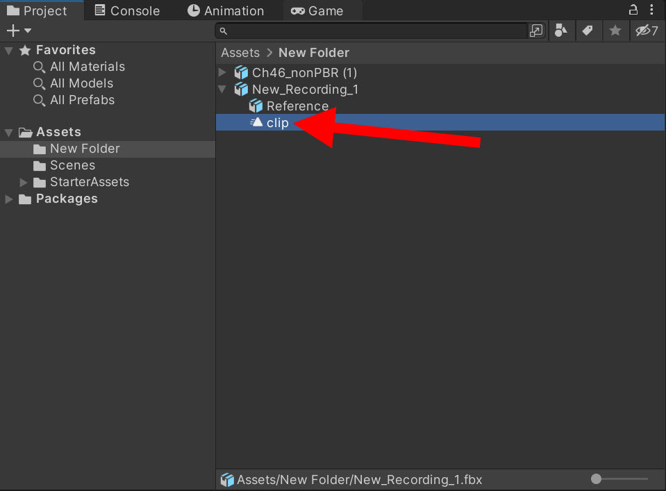 4)3D프로그램에서 정상적으로 내보내기한 애니메이션된 모델을 유니티에서 가져오기하면 모델 에셋의 하위에서 애니메이션 클립을 확인할수있습니다.