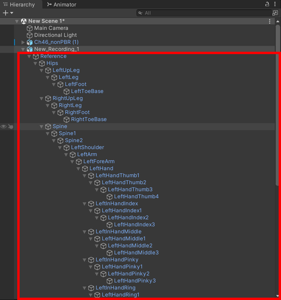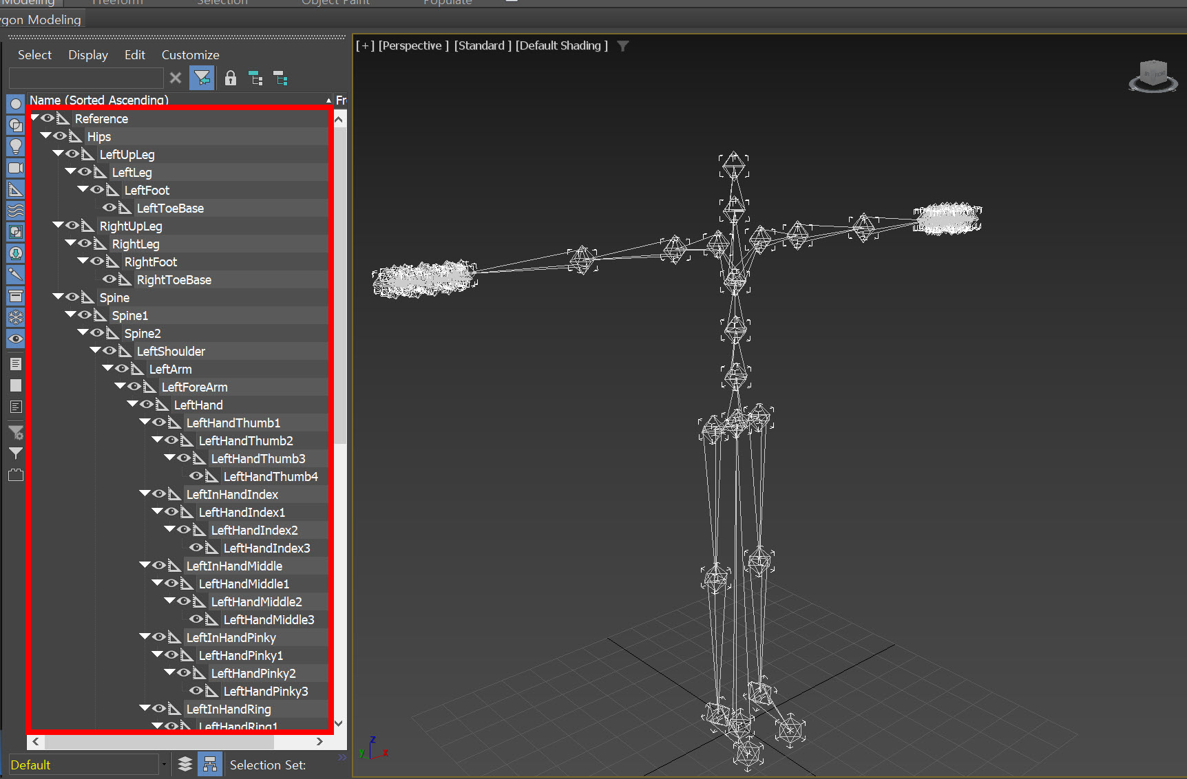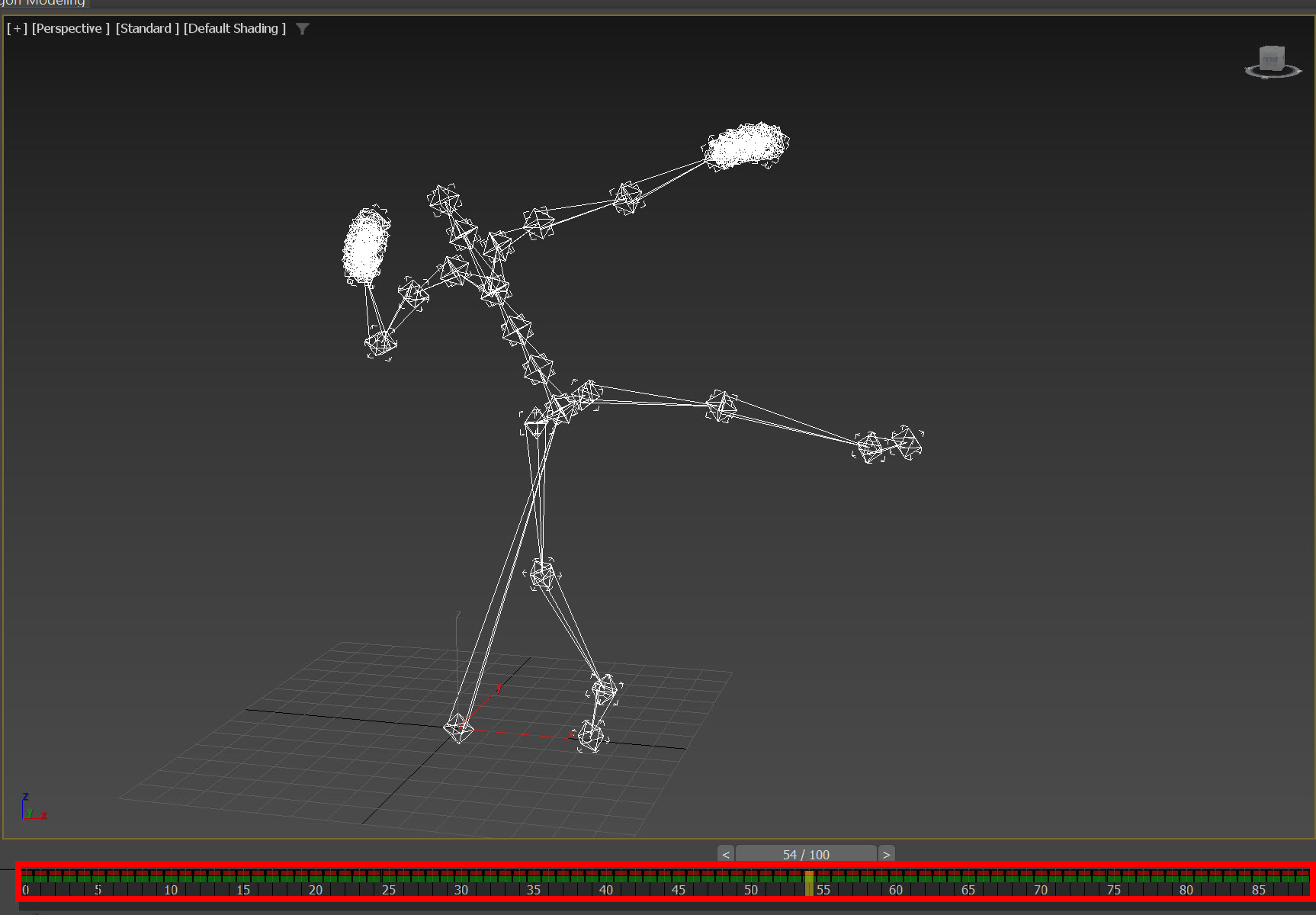 2)애니메이션이 완료된 두번째 캐릭터를 준비합니다. 예에서 지오메트리가 존재하지않고 본 오브젝트로만 구성된 애니메이션된 모델을 3D맥스에서 내보내기하였습니다.