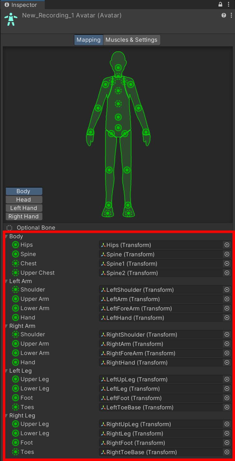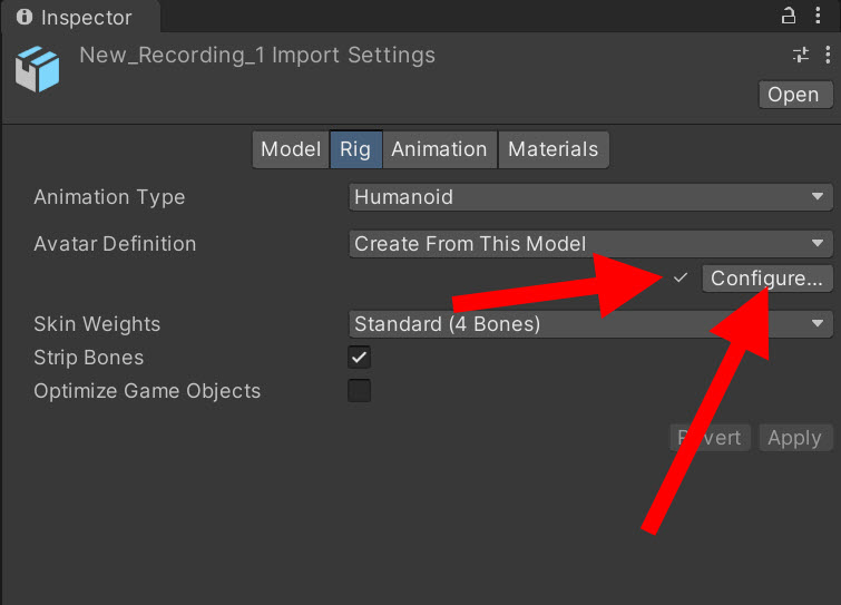 6)모델의 아바타가 정상적으로 생성되면 체크마크를 표시하며 configure에서 해당 모델의 본 오브젝트가 유니티 아바타에 정상적으로 맵핑된것을 확인할수있습니다.