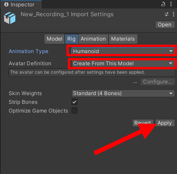 5)해당 모델의 import settings에서 rig를 설정합니다. animation type으로 휴머노이드(humanoid)를 선택하고 avatar definition으로 create from this model를 선택하고 적용합니다(apply)