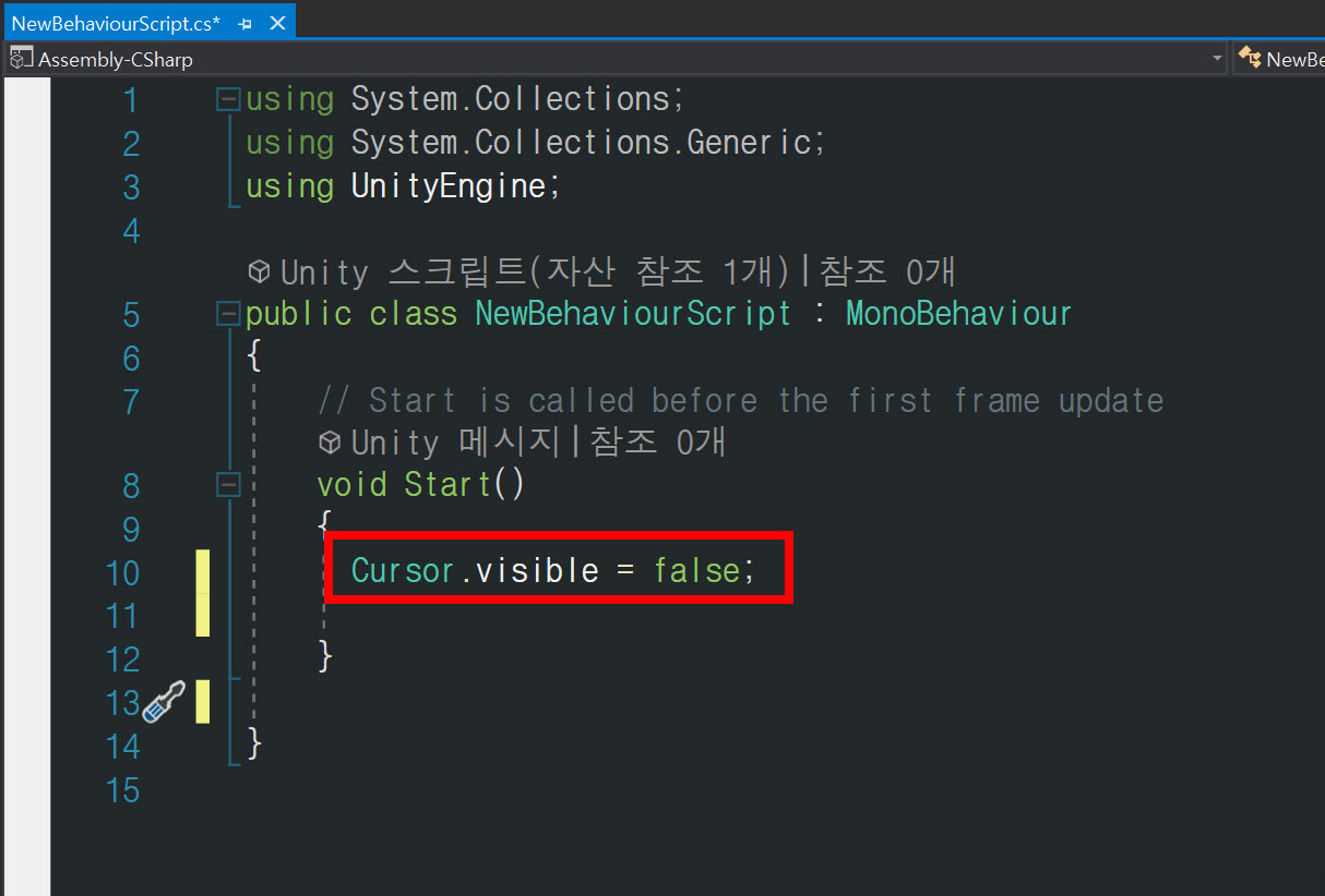 2)유니티에서 새로운 스크립트를 작성합니다. 시작함수에서 커서 표시를 비활성화합니다.