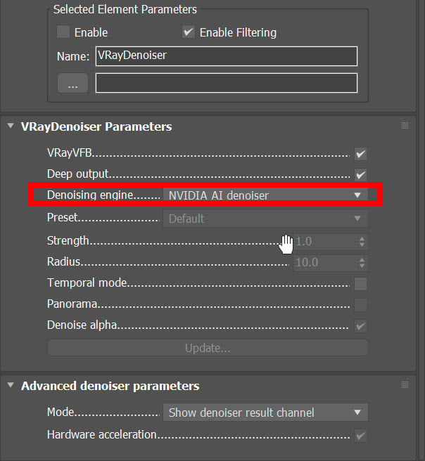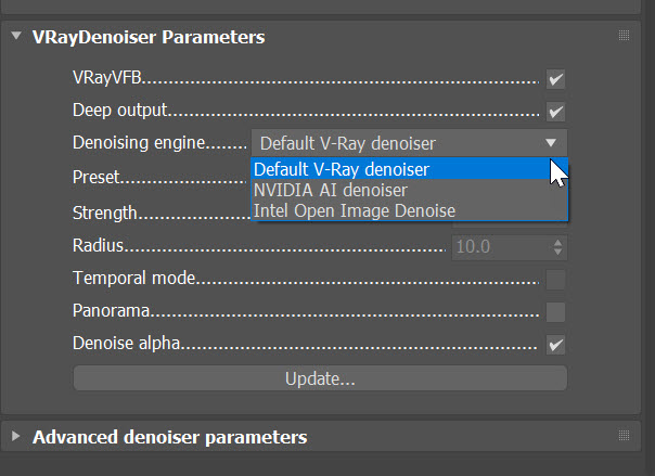 5)VRayDenoiser 파라미터의 Denoising engine에서 디노이저를 선택합니다.