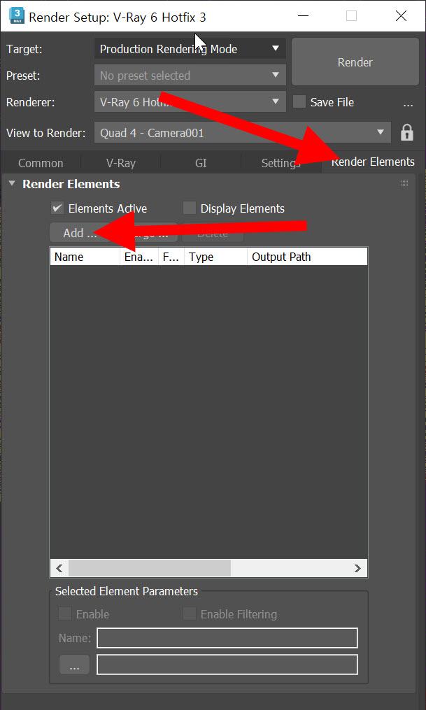 3)렌더 설정(render setup)의 render elements 탭에서 add를 클릭합니다.