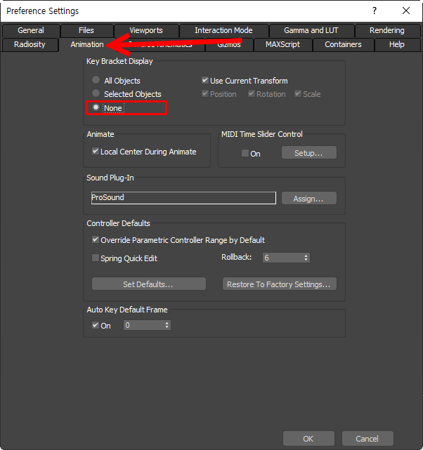 6)animation 탭에서 key bracket display의 none에 체크합니다.