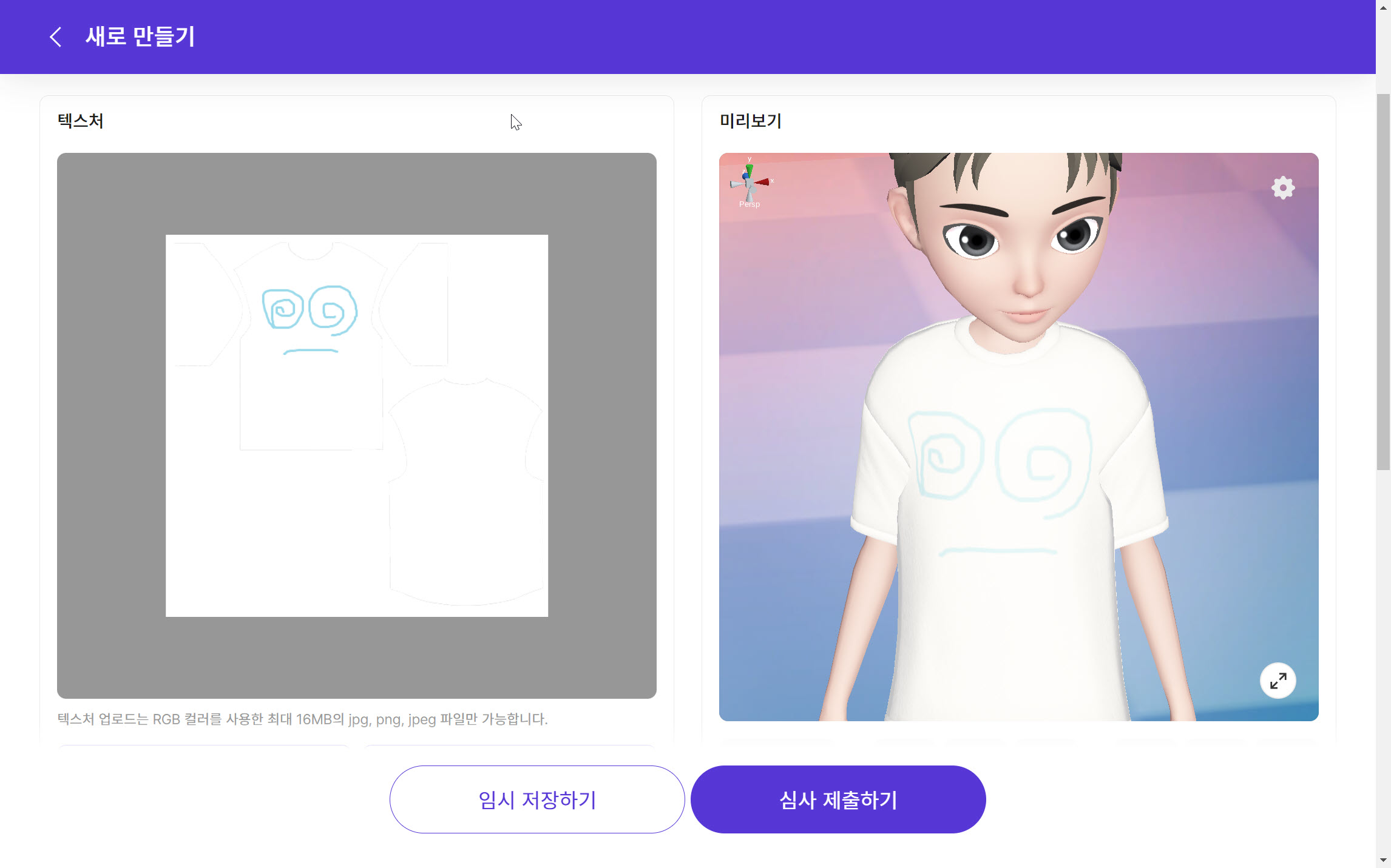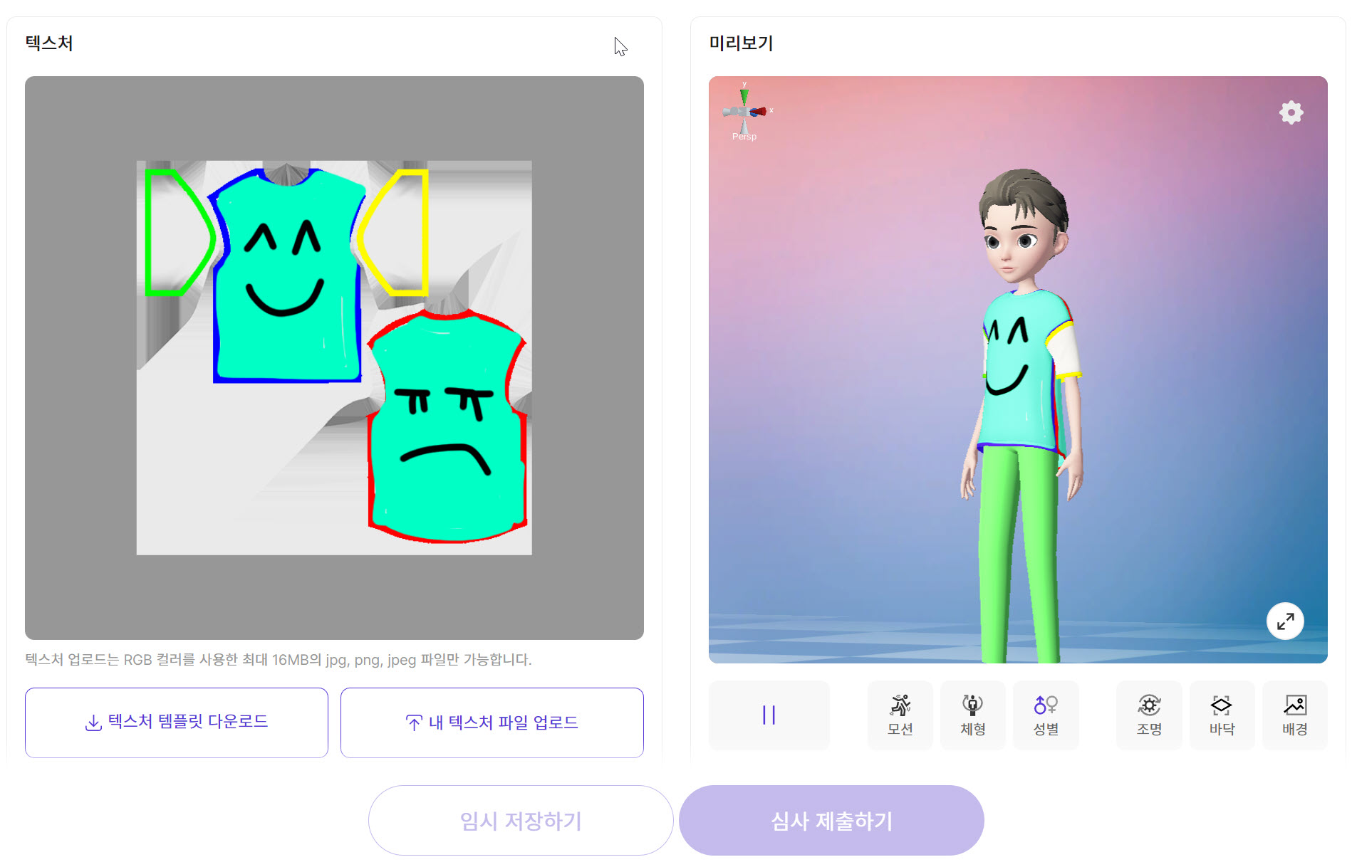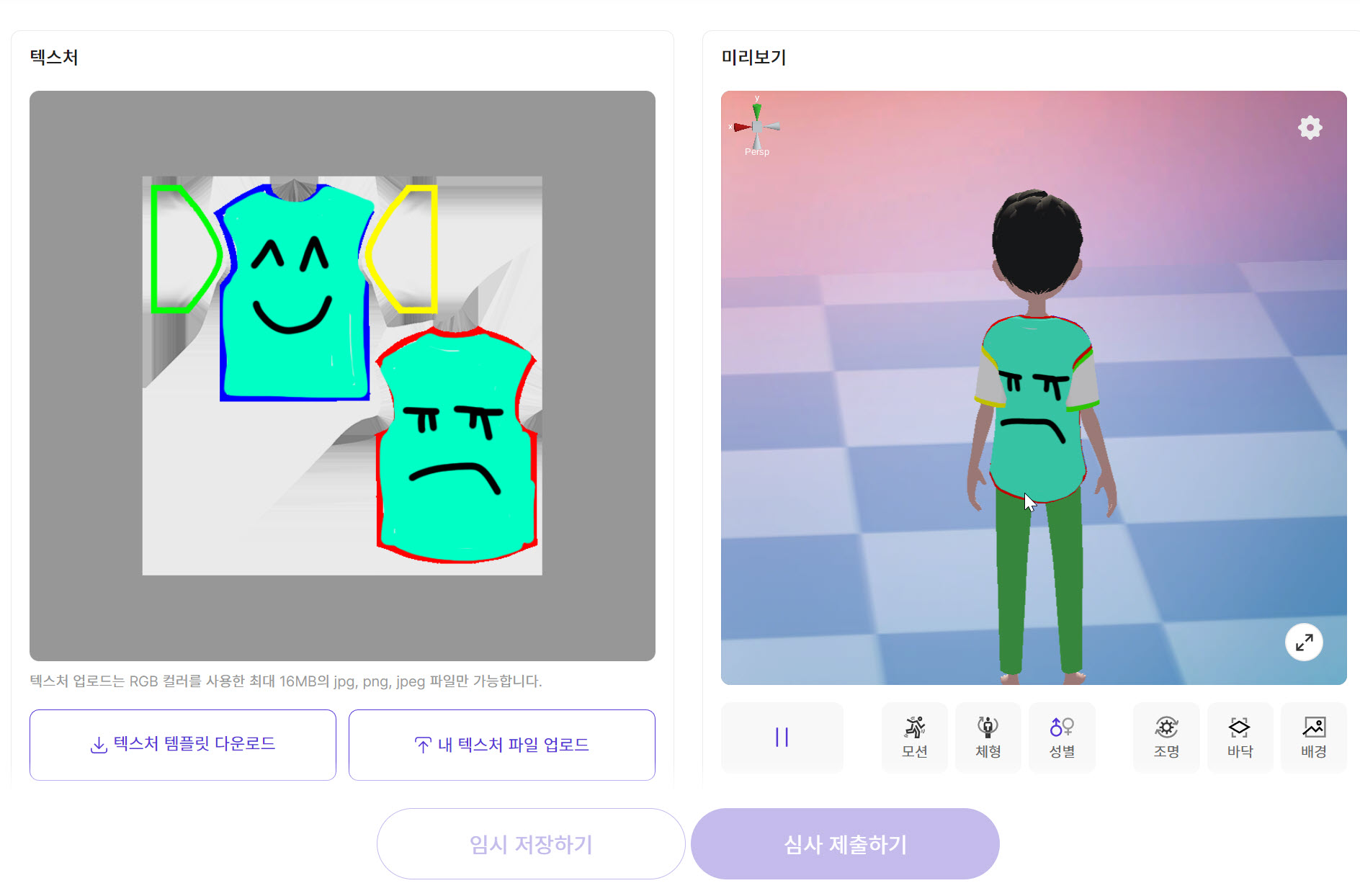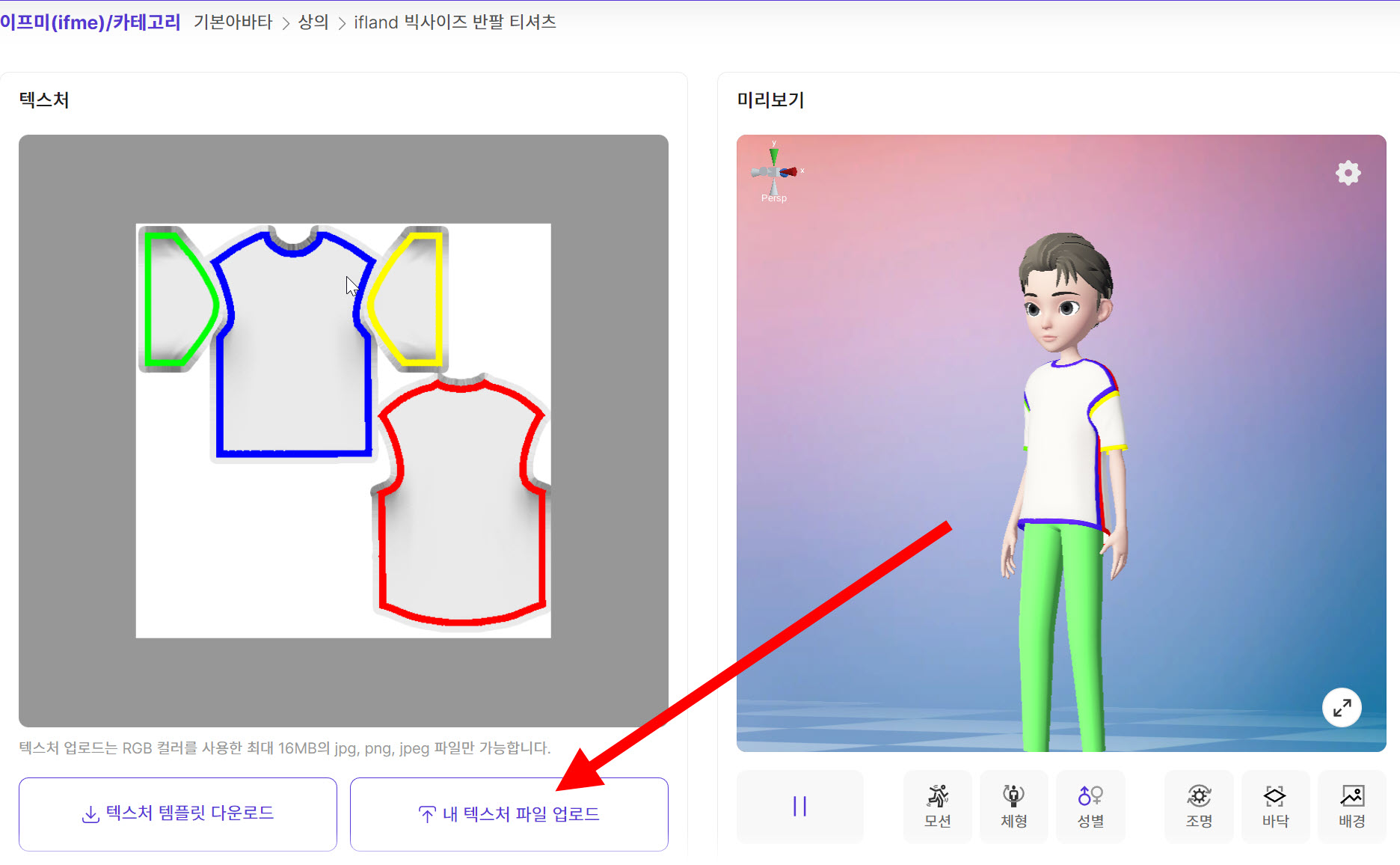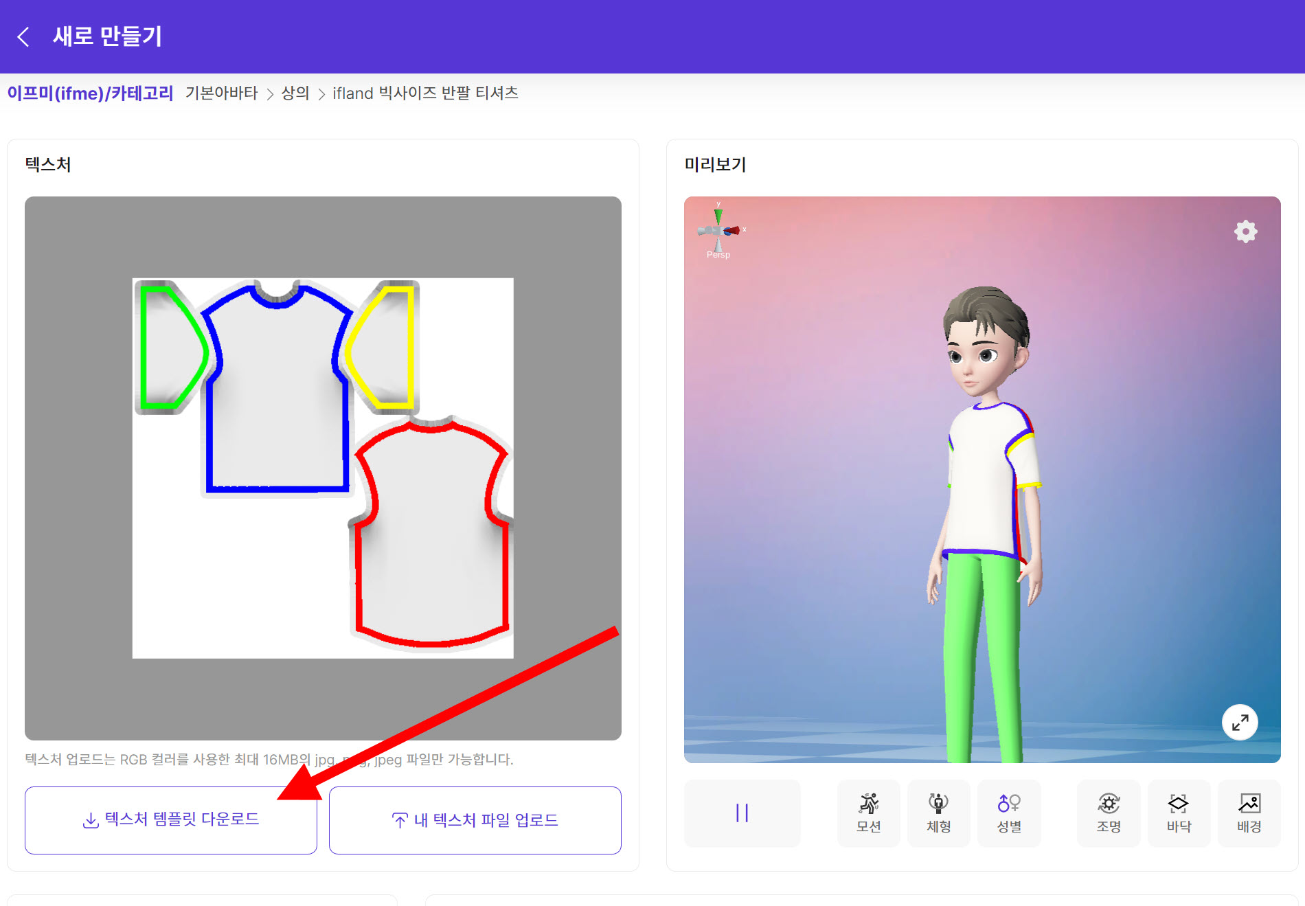15)우측의 미리보기에서 업로드한 텍스처를 아바타에 적용한것을 확인할수있습니다.