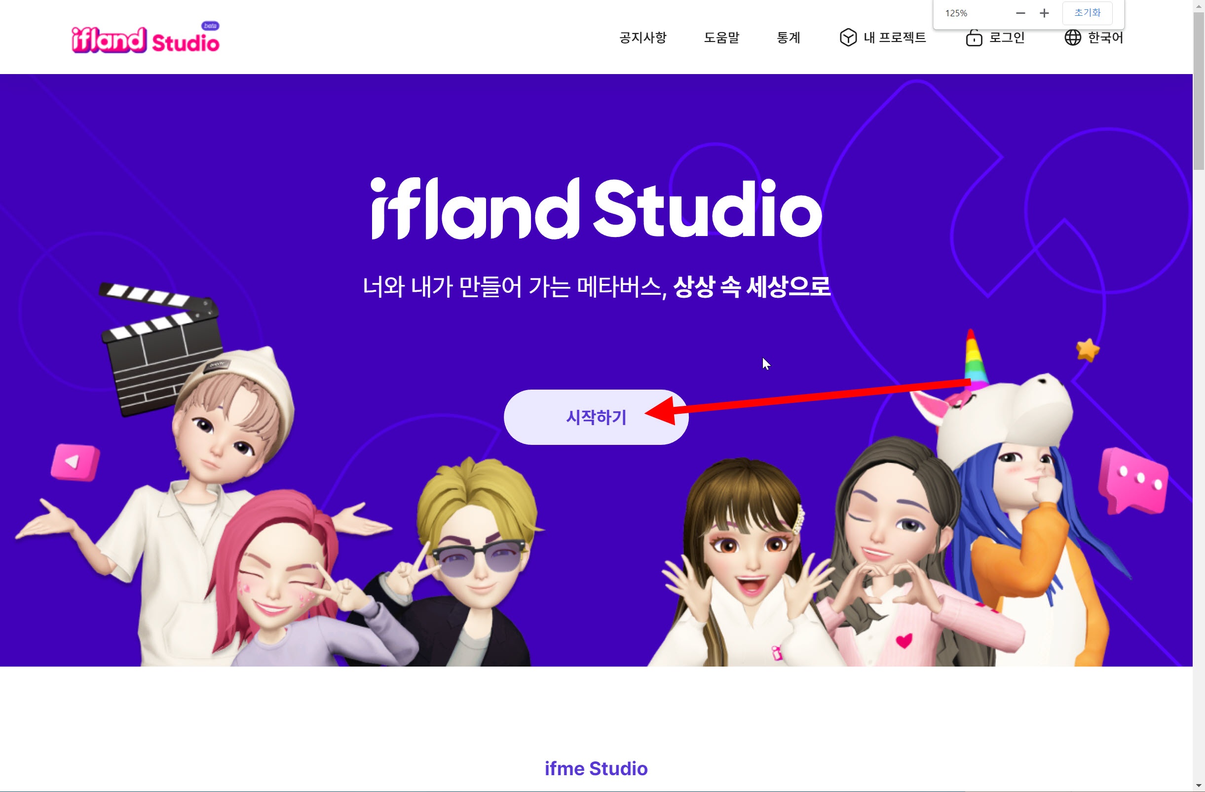 1)이프랜드 스튜디오 웹사이트에서 시작하기를 선택합니다.