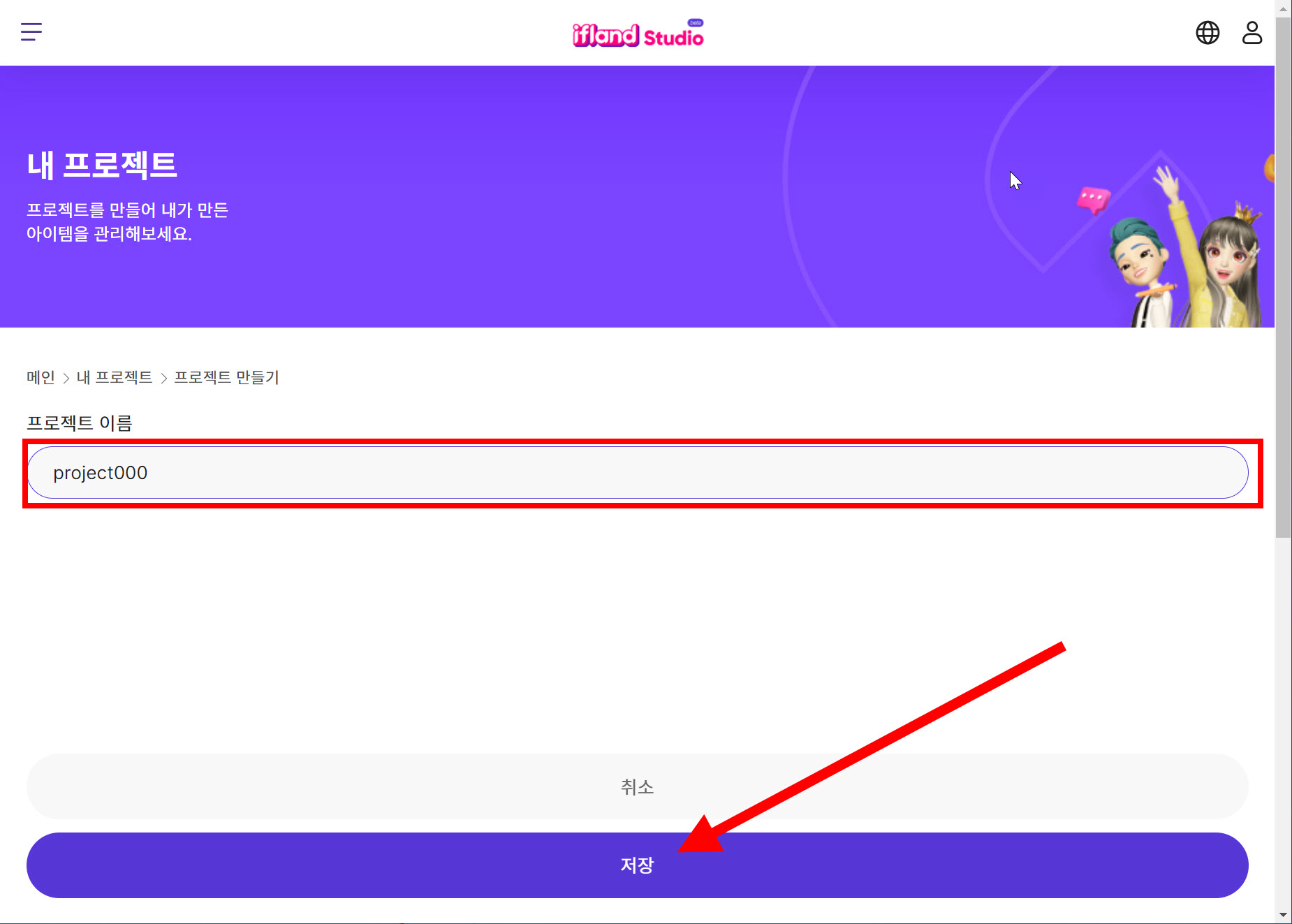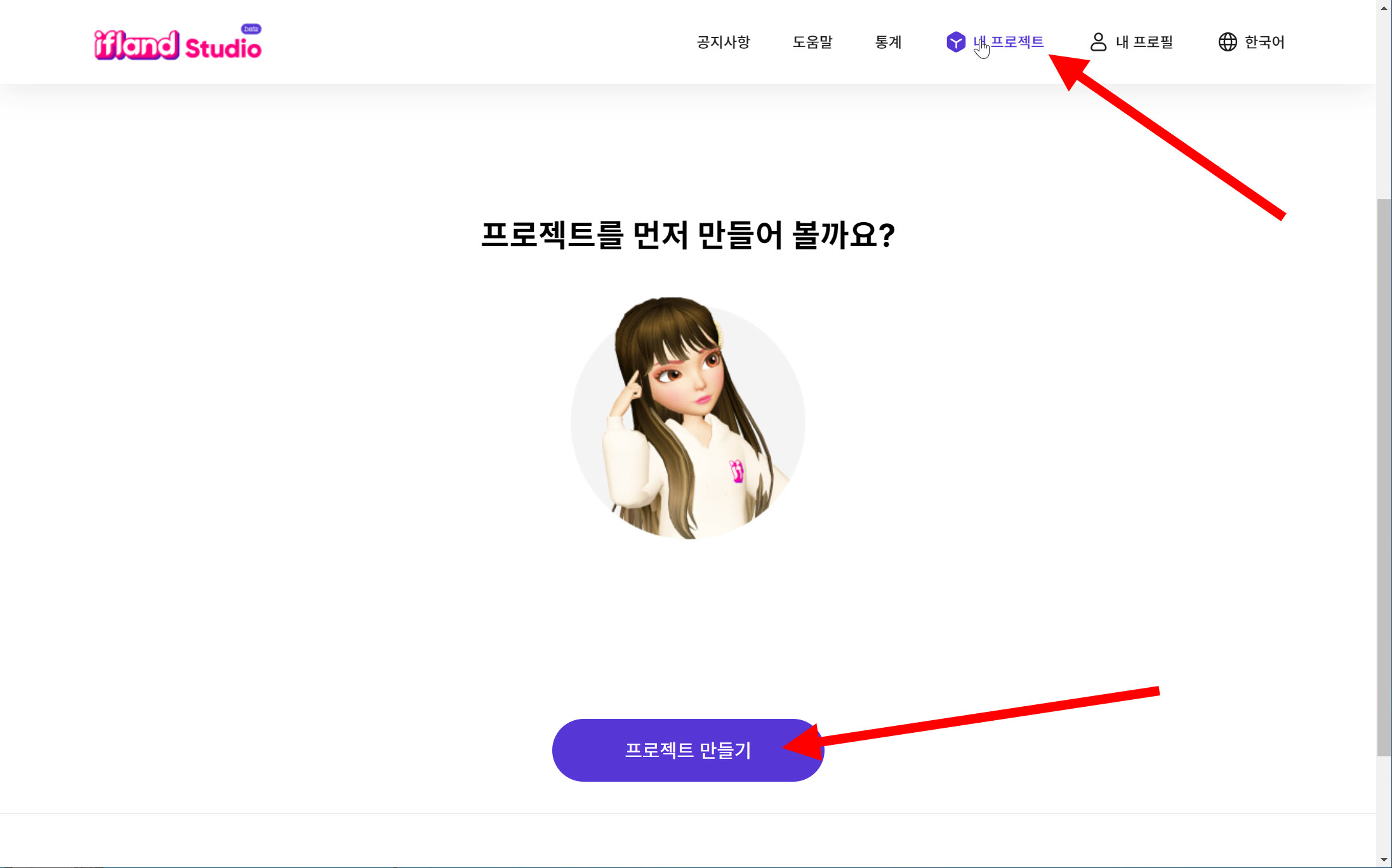 2)상단의 내 프로젝트에서 프로젝트 만들기를 선택합니다.