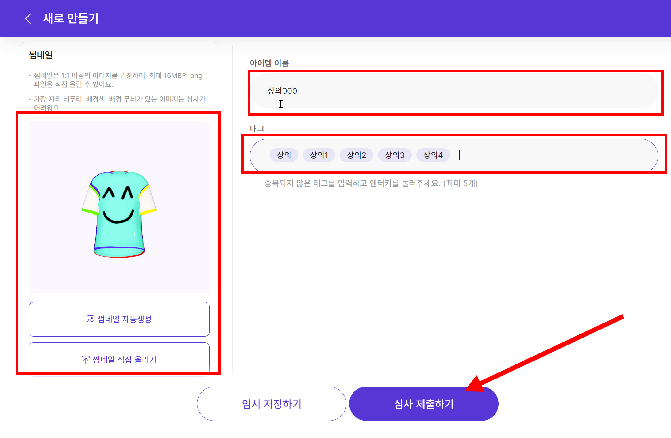 17)아이템의 썸네일, 이름, 태그를 설정하고 심사 제출하기를 선택합니다.