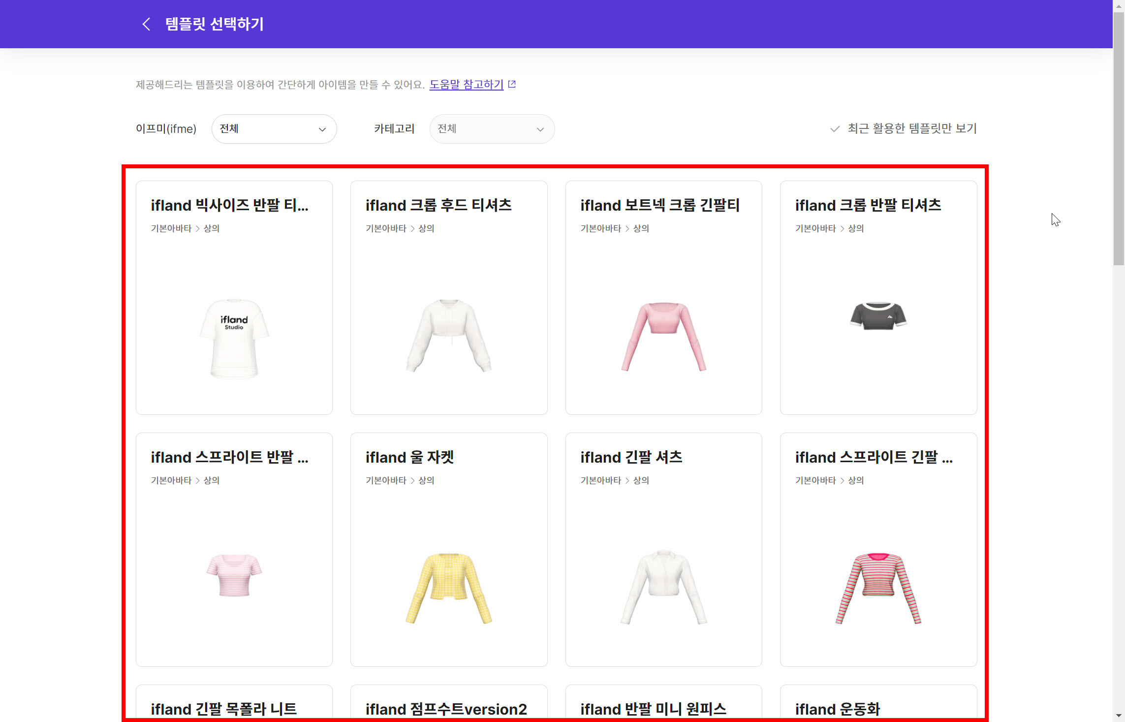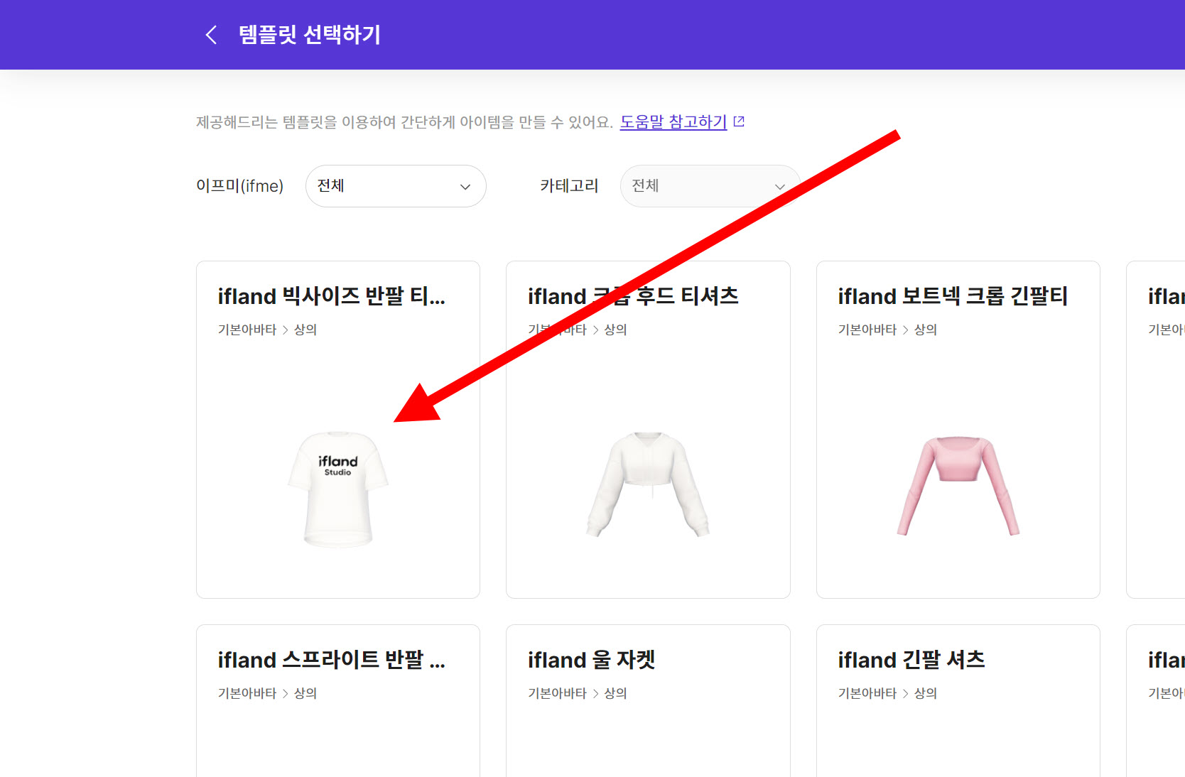 6)이프미/카테고리를 선택하고 아이템 템플릿을 선택합니다. 예에서 기본 아바타의 상의 반팔 티셔츠를 선택하였습니다.
