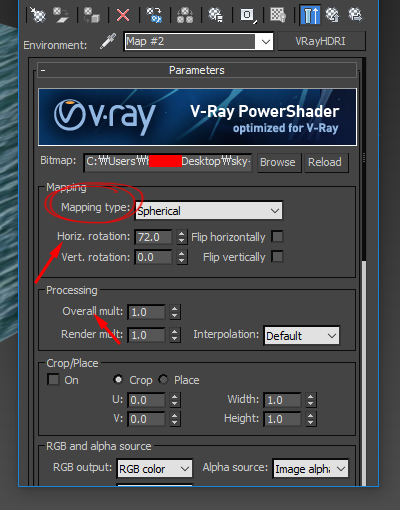 5)VRayHDRI 맵의 Bitmap에서 환경맵으로 사용할 텍스처 이미지를 설정합니다.