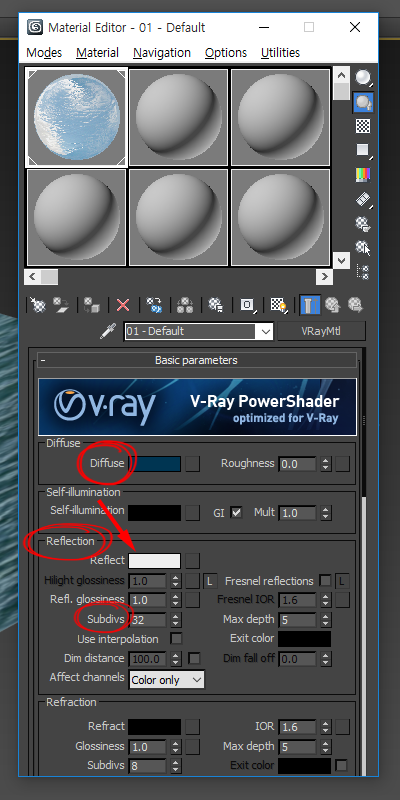 2)브이레이 재질(VRayMtl)에서 diffuse의 색상을 설정하고 reflection의 reflect 색상을 설정합니다.
