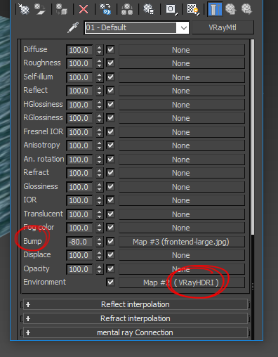 4)재질의 bump 맵에 텍스처를 설정하고 environment에 VRayHDRI 맵을 설정합니다.