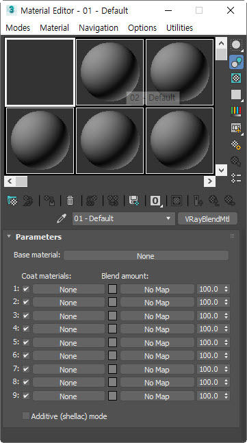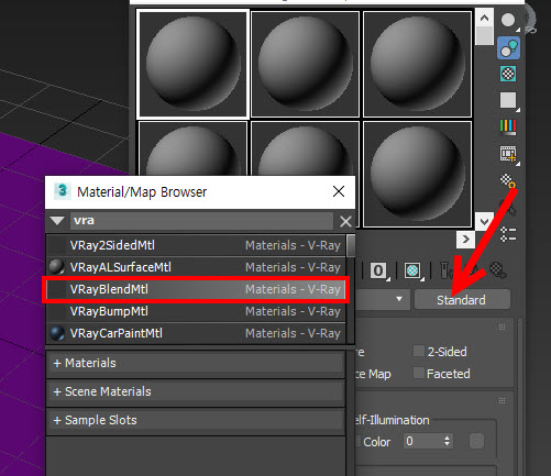 2)재질 편집기의 재질에서 브이레이 혼합 재질(VRayBlendMtl)을 선택합니다.