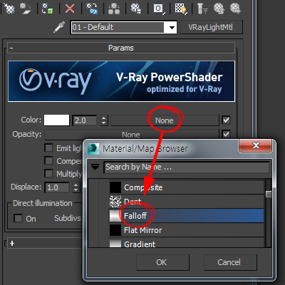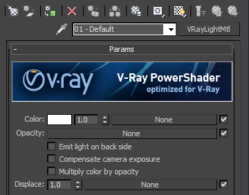 6)새로운 브이레이 조명 재질(VRayLightMtl)을 생성합니다. VRayLightMtl는 이 재질을 할당한 오브젝트를 자체 발광(self-illuminated)하는 표면으로 설정합니다.