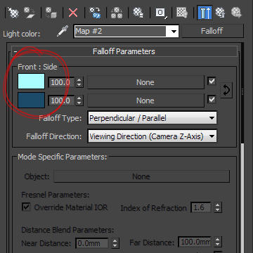 13)falloff 맵에서 front:side의 falloff type을 perpendicular/parallel로 설정합니다.