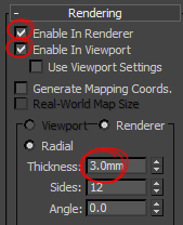 5)enable in renderer에 체크하면 뷰포트를 렌더링했을때 스플라인을 3D 메시로 표시합니다.