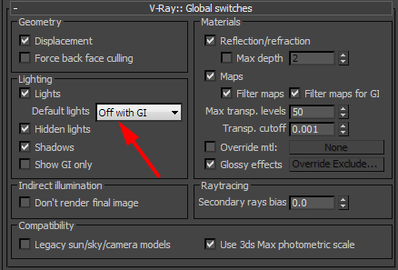 9)global switches의 lighting에서 default lights가 OFF with GI로 기본설정 되어있는것을 확인합니다.