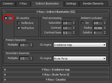 8)브이레이의 렌더 설정(render setup)에서 indirect illumination(GI)를 활성화합니다.