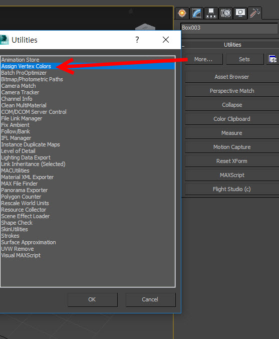 3)버텍스 페인팅(vertex paint)을 사용하여 버텍스 컬러를 설정하려면 유틸리티에서 assign vertex colors를 선택합니다.