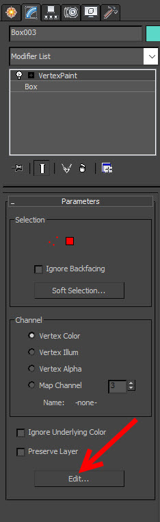 5)오브젝트에 vertexPaint 수정자가 추가된것을 확인할수있습니다. 하단의 edit를 클릭합니다.
