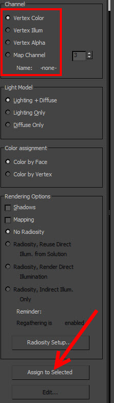 4)페인팅을 진행할 버텍스 속성에 체크하고 오브젝트를 선택한후 하단의 assign selected를 클릭합니다. 예에서 알파를 제외한 컬러를 설정하기위해 vertex color 채널에 체크하였습니다.