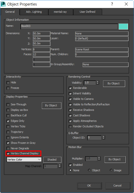 7)폴리곤 오브젝트의 속성(object properties)에서 vertex channel display에 체크합니다.