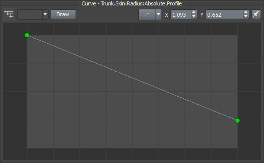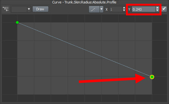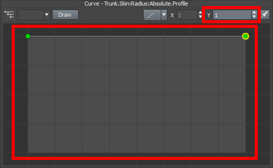 8)커브의 시작과 끝 포인트를 선택하고 y값을 1로 설정합니다. 이것은 현재 나무줄기의 반지름이 높이에 따라서 변하지않는것을 의미합니다. 반지름은 radius의 absolute에서 입력한 값의 1배수입니다.