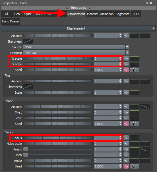 2)trunk의 displacement에서 U scale, V scale 수치를 0으로 설정합니다