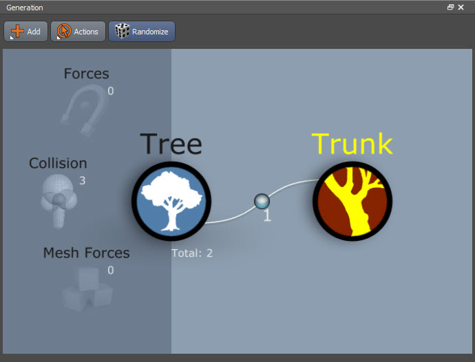 1)generation 윈도우에서 나무의 줄기(trunk) 제너레이터를 생성합니다.