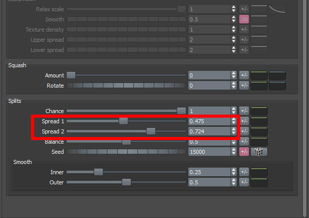 5)spread1, spread2의 수치를 조절하여 갈라진 갈래의 방향을 설정합니다.