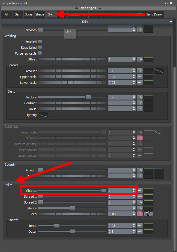 3)trunk 제너레이터의 skin에서 splits의 chance에 수치를 입력합니다(1)