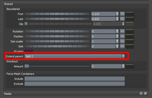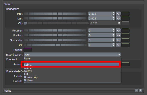 11)extend parent를 split1로 변경하면 갈래에서 두개중 하나에 나뭇가지를 연장합니다.