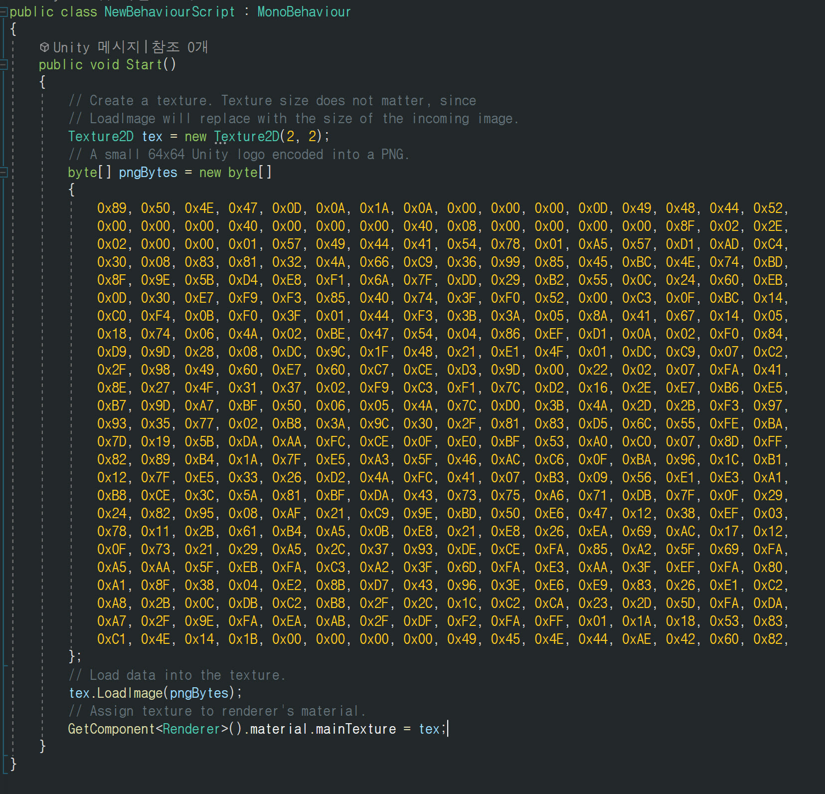 새로운 텍스처를 생성하고 이미지의 바이트 배열을 텍스처로 로드합니다. 해당 텍스처를 스크립트의 게임오브젝트 재질의 메인 텍스처로 사용합니다.
