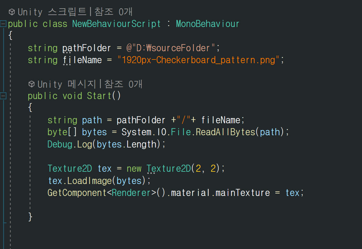2)유니티에서 스크립트를 작성합니다. 지정한 경로의 이미지 파일을 읽기하고 텍스처로 로드하여 게임오브젝트의 메인 텍스처로 사용합니다.