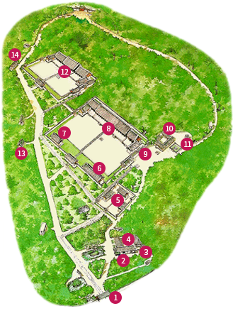 1외대문(정문), 2망묘루, 3공민왕신당, 4향대청, 5재궁, 6공신당, 7칠사당, 8정전, 9정전수복방, 10전사청, 11제정, 12영녕전, 13정전 악공청, 14영녕전 악공청