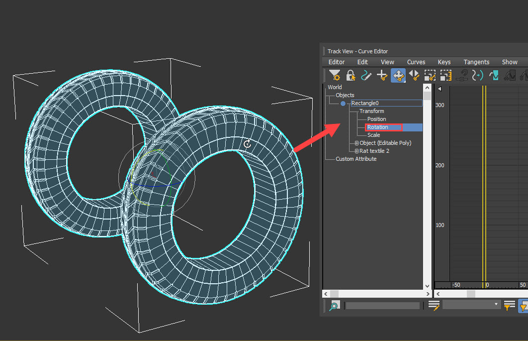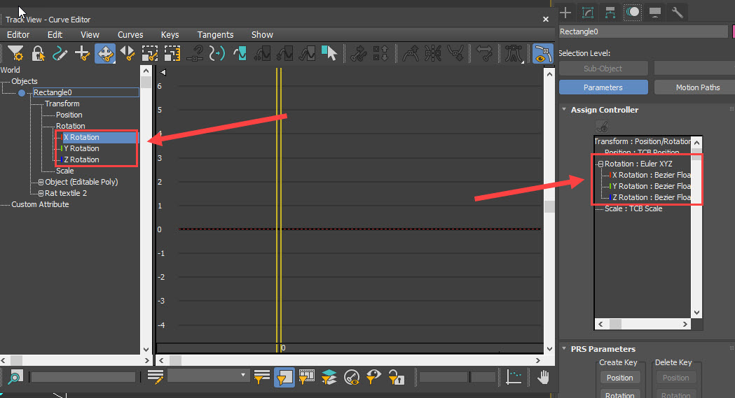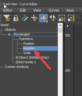 3)오브젝트의 커브 에디터(track view)에서 rotation 트랙을 선택합니다.